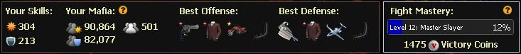 - Attack = (Attack Skill Points * Mafia Size * 0.01) + Attack Equipment Score