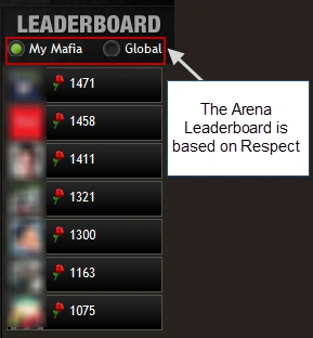 The Arena Leaderboard is based on Respect. Climb up the ladder by earning more Respect! Both Global and Mafia Leaderboards are available for the Arena.